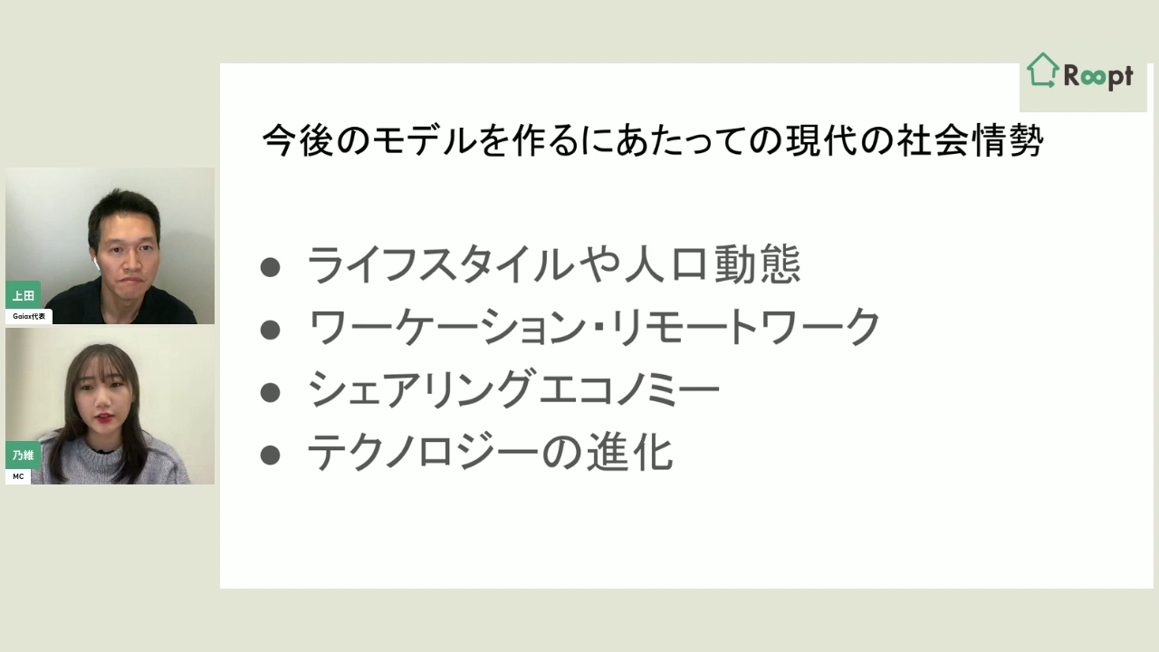 1つ目がライフスタイルや人口動態、2つ目がワーケーション・リモートワーク、3つ目がシェアリングエコノミー、4つ目がテクノロジーの進化です。